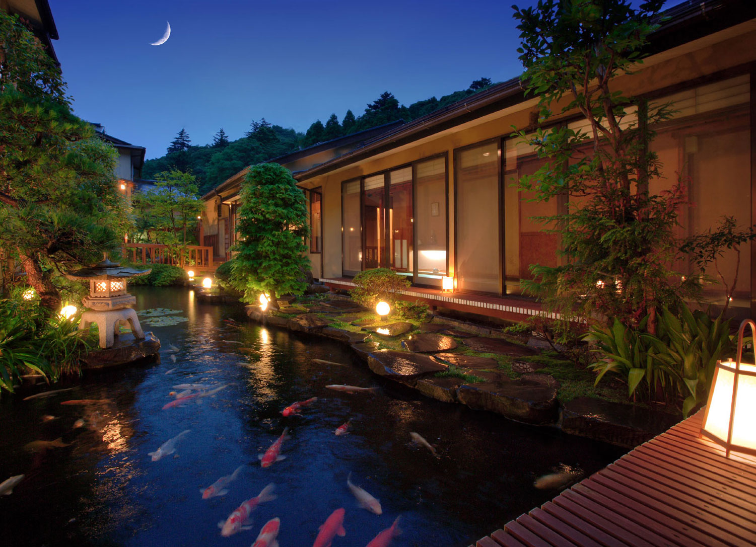 和の風情を感じる純和風の日本庭園「緑水園」。夜になるとライトアップされ、